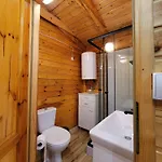 Tot de badkamerfaciliteiten van deze hut behoren ook een apart toilet en een douche.